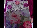 I covered the original brown faux leather with fabric cut from a blouse that someone gave me, which did not fit. Then I added lace, a ribon and flowers to brightten it up. There are plenty of blank pages for writing or drawing, as well as some added cards and tags. Isn't it beautiful? Who do you know who would love to own this?
